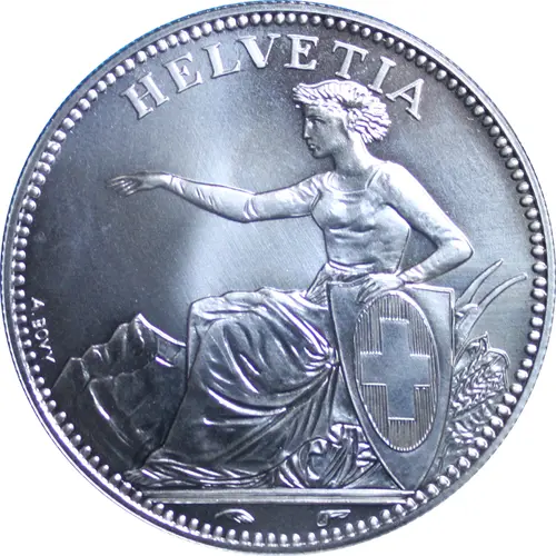 Obverse reproduction of the Swiss 5 Franken from 1850 to 1884 (KM#11) with the addition of 2 symbols at the 6 o`clock position. |