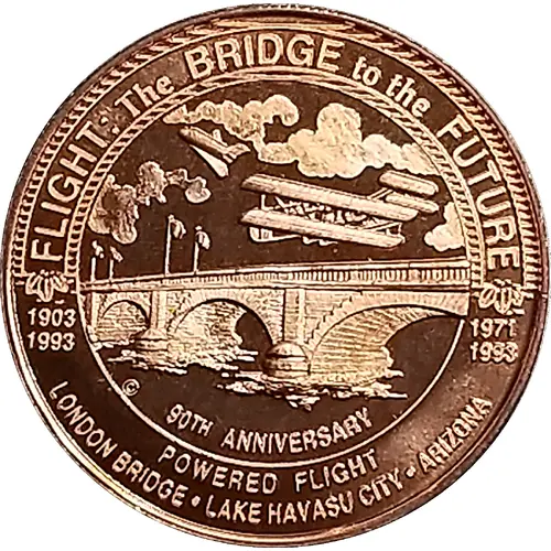| Obverse lettering | FLIGHT: The BRIDGE to the FUTURE 1903 1993 1971 1993 90TH ANNIVERSARY POWERED FLIGHT LONDON BRIDGE LAKE HAVASU CITY ARIZONA |