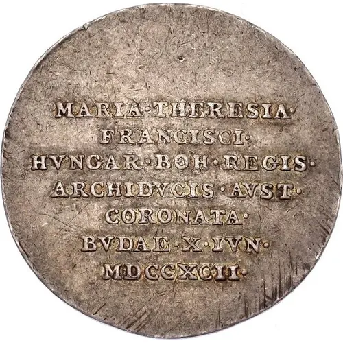 | نوشتههای روی مدال | MARIATHERESIA FRANCISCI HVNGARBOHREGIS ARCHVIDSAVST CORONATA BVDAEXIVN MDCCXCII |