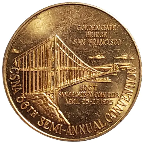 | Obverse lettering | GOLDEN GATE BRIDGE SAN FRANCISCO HOST SAN FRANCISCO COIN CLUB APRIL 25-27,1975 CSNA 56TH SEMI-ANNUAL CONVENTION- APRIL 13-16-1967 |