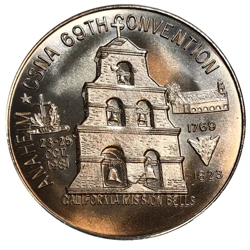 | Obverse lettering | Anaheim * CSNA 69th Convention 1769 23-25 Oct. 1981 1923 California Mission Bells |