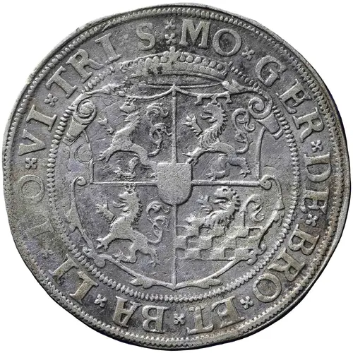 Obverse description Crowned quartered arms of Bronckhorst-Brederode-Batenburg-Mark in ornate frame.