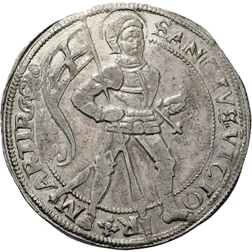 | Obverse description | Full-length figure of Saint Victor right, helmeted and armored with sword slung behind him, holding a flag on long staff in right hand, dividing inner circle and legend. |