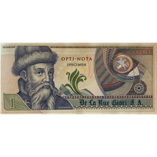| Obverse lettering | OPTI-NOTA SPECIMEN GUTENBERG De La Rue Giori S.A. |