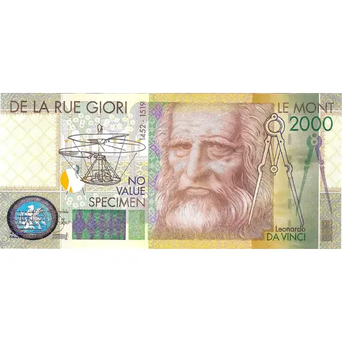 Obverse lettering DE LA RUE GIORI LE MONT 1452 - 1519 2000 NO VALUE SPECIMEN Leonardo DA VINCI