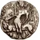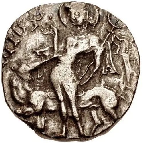 | Obverse description | King as Siva Pashupati `Lord of the Beasts` standing facing left, making a mudra with his right hand, holding a filleted trident in his left, with a lioness or tiger standing left behind him and a trace of Brahmi `meghana` in the upper left. |
