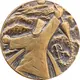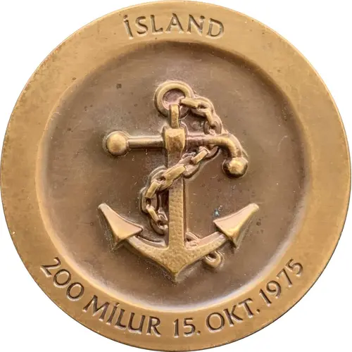 Sailor on a boat holding an anchor attached to a buoy, sun and ship at top in background.