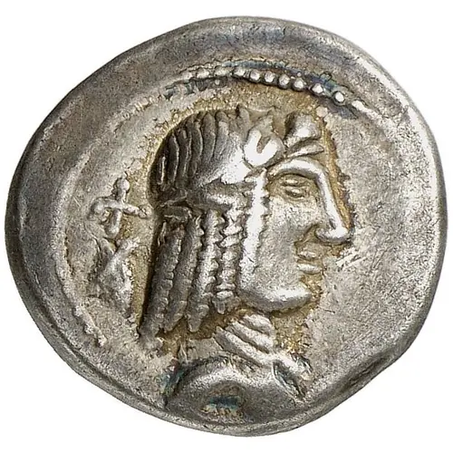 | توضیحات روی سکه | Head of Apollo facing right, his hair bound with fillet; behind, cross and monogram. |