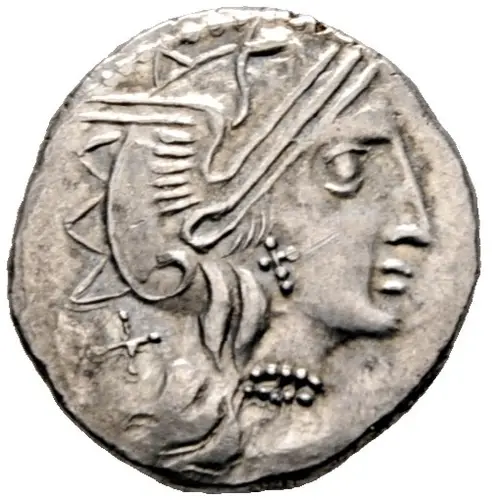 | توضیحات روی سکه | Stylized head of Roma with winged griffin helmet facing right. X in the field behind. |