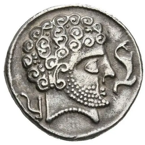 | توضیحات روی سکه | Head right with short beard, dolphin before, plough behind |