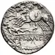 Three soldiers on horseback galloping left, each holding spear in right hand and shield in left hand, trampling over fallen warrior and two standards. Moneyer mark in exergue. |