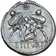 | Reverse description | Tarpeia facing, buried to waist in shields, raising both hands trying to ward off two soldiers on either side about to cast their shields on her; above, star on crescent moon. Part of moneyer mark in exergue. |
