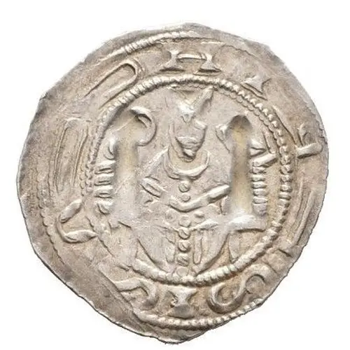 Church with central dome or pediment flanked by two towers, each with a pellet above, all above an arcade, and below large cross. Line of three dots in exergue. |