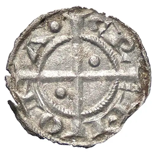 | Descripción del anverso | Long cross pattée dividing legend and inner reeded circle. Pellet in second and third quarters. |