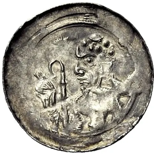 Obverse description Religious bust turned left, holding out the right hand and holding a crosier in his left. Star at top left of bust.