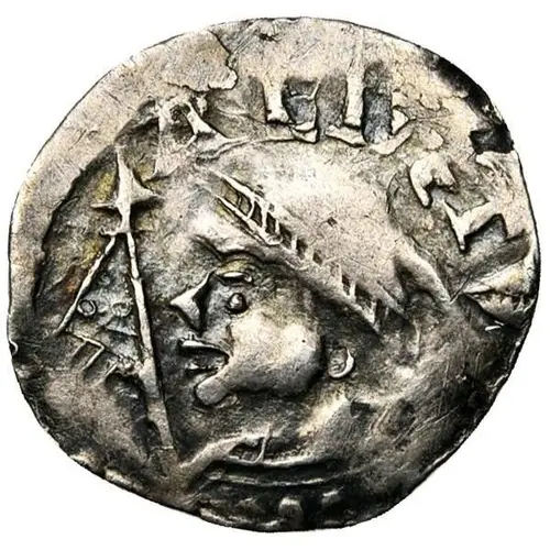 | Mô tả mặt trước | Diademed bust left, holding banner in front. |