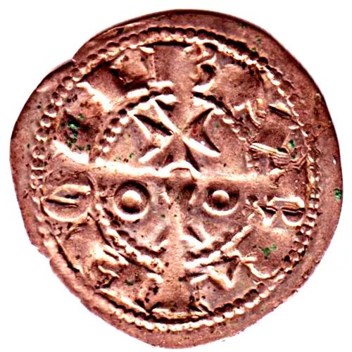 | Obverse description | Cross placed on a pole between two annulets. Legend around, between beaded circles. |