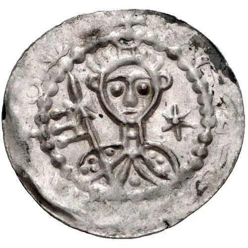 | Opis awersu | Half-length bust of uncertain figure facing, holding cruciform banner; cross to right; all within pelleted border; faint illegible legend around. |