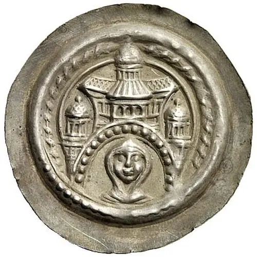 | Description de l’avers | Facing bust within archway of towered monastery. |