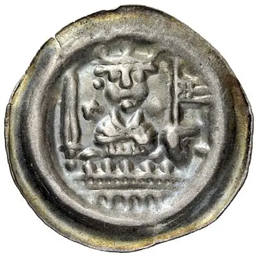 | Obverse description | Crowned facing half-length figure over fortified wall holding sword and flag. |