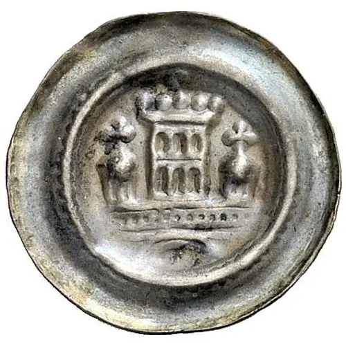 | Obverse description | Fortified wall with small arch at bottom, large tower at center and two small church towers with crosses to the sides. |