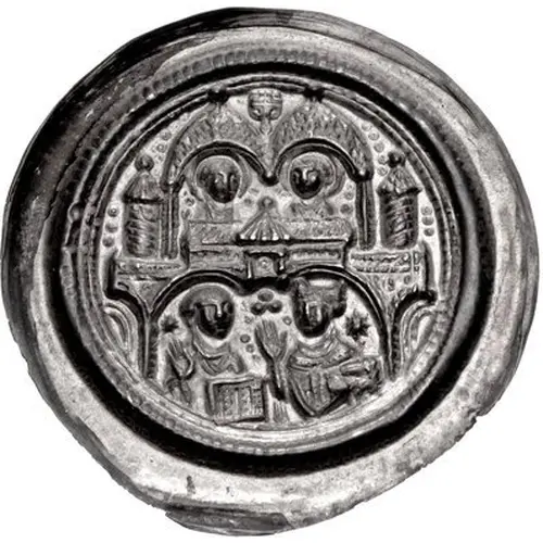 | Obverse description | Abbey with two towers and two domes, two nuns on second floor; below, confronted busts of Beatrix, holding gospel, and bishop, holding gospel and raising hand in benediction; cross above, pellets around |