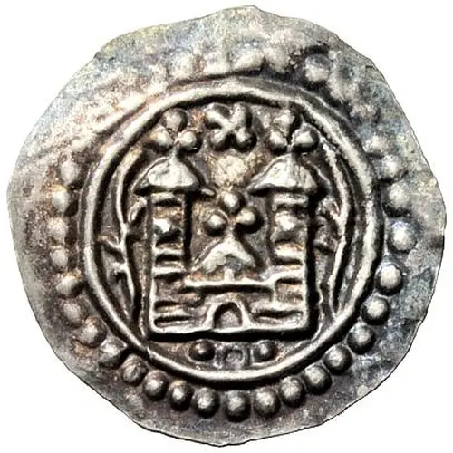 | Aversbeschreibung | Two towered church facade with central arch, two vines to the sides. Crosses on the towers and cross between the towers, under the arch at bottom a ring with dots to the sides. |