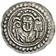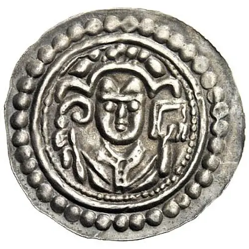 | Obverse description | Half-length facing figure wearing mitra holding crozier and bible, three arches above. |