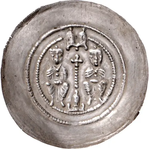 | Obverse description | Ruler and his wife seated with cross staff in between, two small towers above and small tower with wall at bottom. |