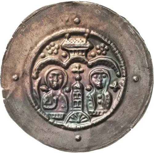 | Ön yüz açıklaması | Tower separating half-length figures of Saint Cyriacus and of Gertrud, three arches with building above. Three dots and two rosettes on the sides of the building. In outer field four dots. |