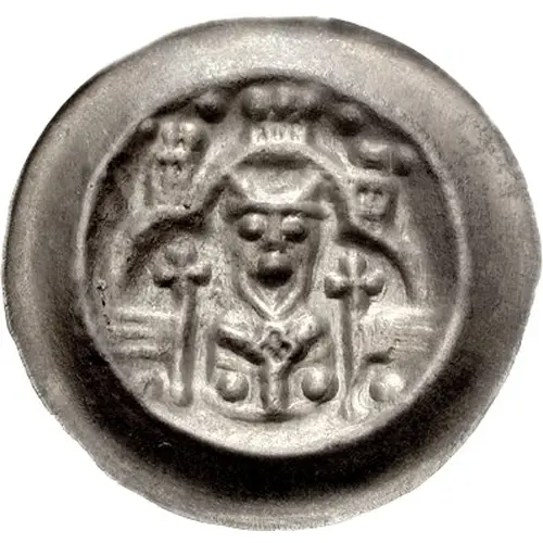 | Descripción del anverso | Bust of Heinrich facing, holding in each hand a standard surmounted by cross; all within architectural framework. |