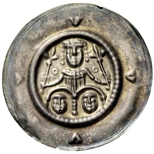 | Obverse description | Half-length facing figure holding two lilly scepters over two arches with two busts below, rings to the sides. |