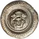 Facing bust of the abbott with crozier and lilly-staff, above three arches with building.