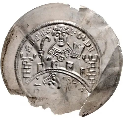 | Descrizione del dritto | Half-length figure of Saint Martin holding crozier and bible over fortified wall between two towers. |