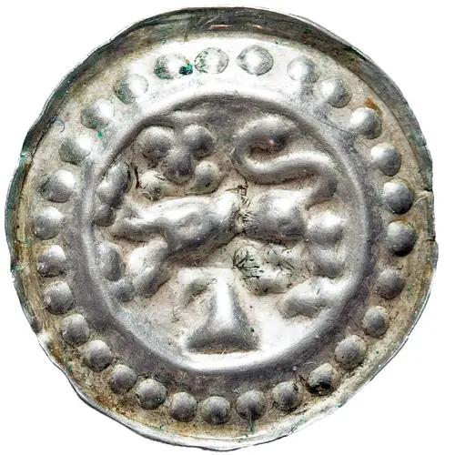 | Obverse description | The leaping lion to the left in a rough beaded circle, its head turned towards the viewer, above a letter-like symbol (inverted L) |