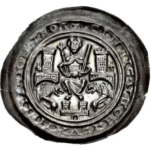 | Obverse description | Henry seated facing, atop two-turreted castle, holding lis-tipped scepter and sword; towers and reverted lions flanking |