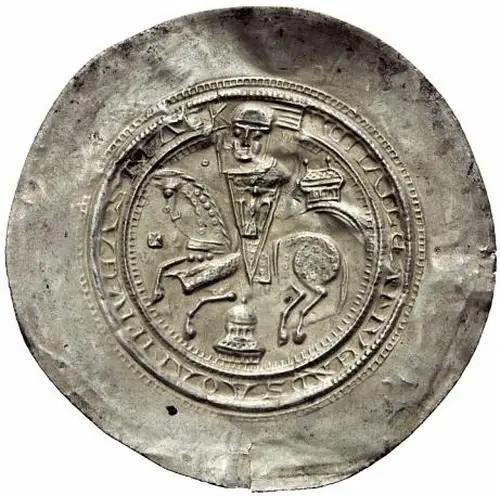 | Obverse description | Landgrave on horseback turned left holding a spear with flag and a shield, below and on the top right a church tower. To the left a cross and to the top left a small ring. Legend surrounding. |