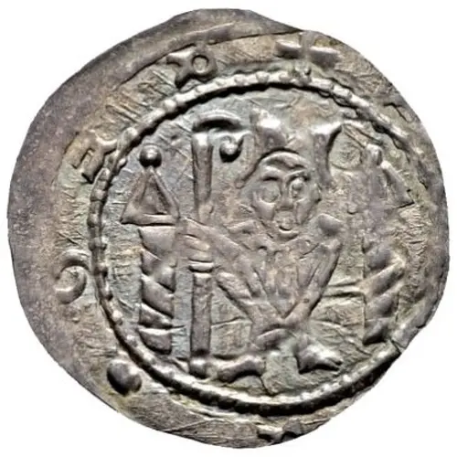 | Popis líce | Standing bishop within beaded circle, facing and holding a crozier between two towers. Legend surrounding. |
