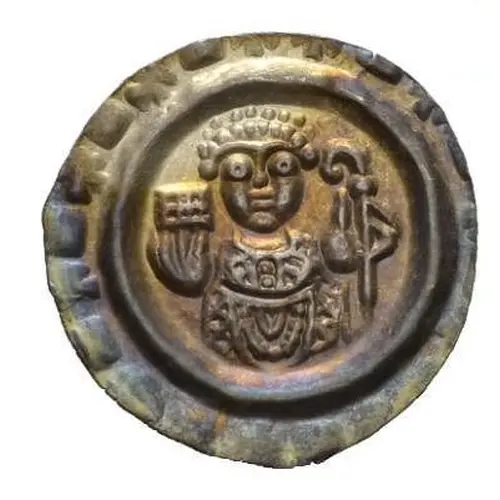 | Obverse description | Half-length figure facing, wearing episcopal regalia and holding reliquary and crozier; all within linear border; alternating bars and crosses around. |