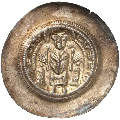 | Descrizione del dritto | Facing standing abbott with two opened hands, two towers to sides. |