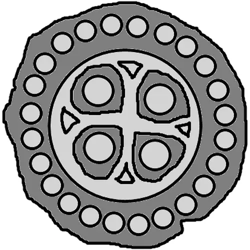 | 正面描述 | Four dots around cross with ends curving into the bordering circle, all surrounded by a ring of dots. |