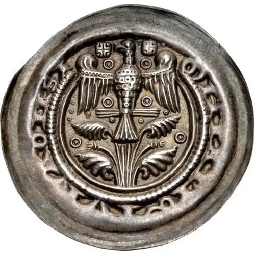 | Beschrijving voorzijde | Eagle facing, wings spread, head left, atop plant; pellets-in-annuets around, crosses flanking head |