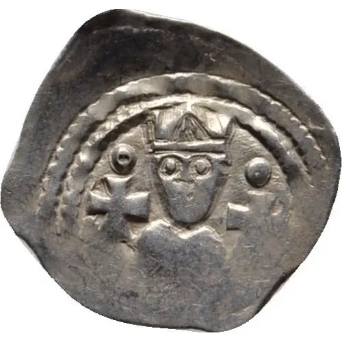 | Obverse description | Crowned character between crosses under annulets. |
