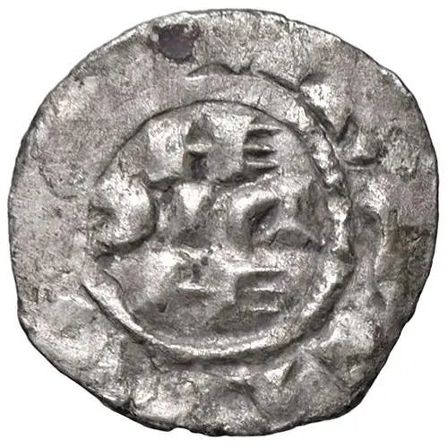 | Beschrijving voorzijde | Emperor name in shape of cross in center using ligatured HE, within beaded border, legend around. |