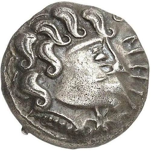 | Arka yüz açıklaması | Horse leaping right, below three beaded wheels set in triangle; in front, a star. Degenerate legend. |