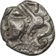 正面描述 Head facing left, with crested and plumed helmet with raised visor; granulated.
