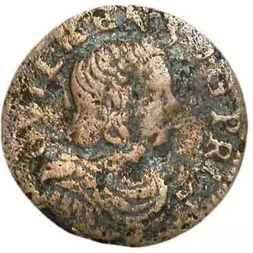 Aversbeschreibung Bust of the prince to the right, draped and armored. Bust cuts legend.
