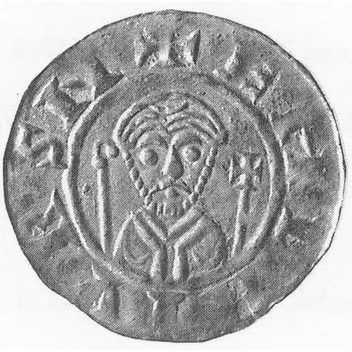 | Obverse description | Facing bareheaded bust holding crozier and cross-tipped staff, within inner circle. |