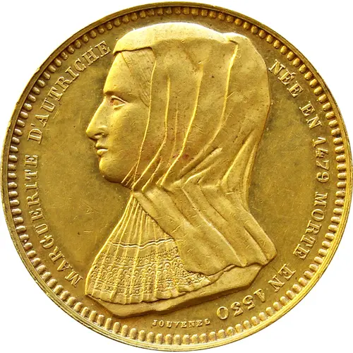 TANTE DE L`EMPEREUR CHARLES - QUINT. 1507. GOUVERNANTE DES PAYS-BAS. ELLE DIRIGEA LA POLITIQUE DU PAYS DE FAÇON A FAIRE RESPECTER ET HONORER LES BELGES. A MALINES OÙ ÉTAIT SA COUR ELLE ACCUEILLAIT ET PROTÉGEAIT LES ARTISTES, LES LITTÉRATEURS ET LES SAVANTS. |