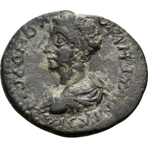 Obverse description Bare-headed bust of Commodus (short beard) wearing cuirass and paludamentum, left, seen from rear.